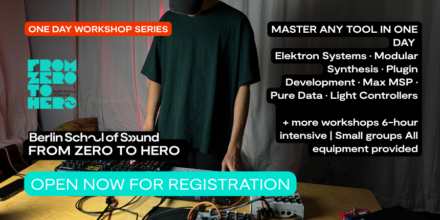 Berlin School of Sound presents From Zero to Hero – a series of Saturday Master Workshops designed for producers, musicians, and sound artists who want to master specific tools and techniques in electronic music production. Whether you’re a complete beginner or an experienced producer looking to expand your toolkit, our expert-led workshops take you from foundational concepts to advanced techniques in a single, intensive session.